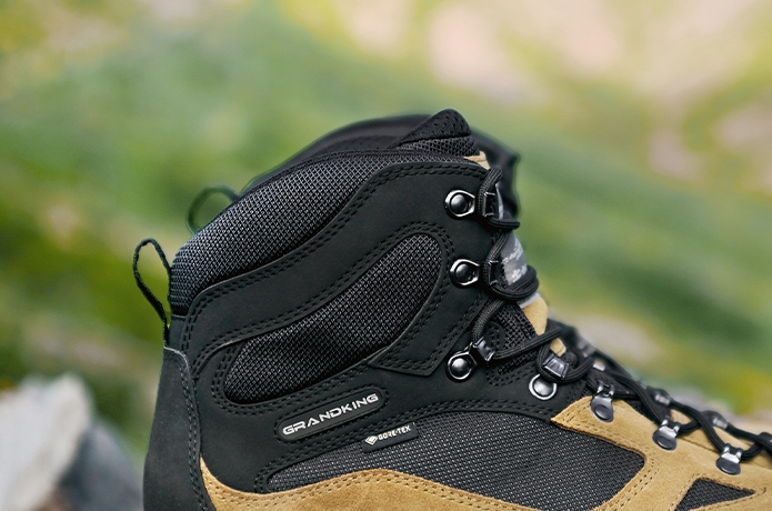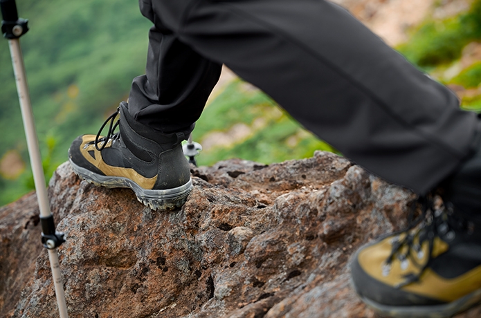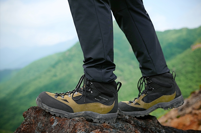 岩場などで段差がある下りでも、「GK8X_FFF」は頼りになります。アッパー素材に採用したスエードレザーとメッシュポリエステルが、運動性と剛性を両立。足が捻じれにくくて横ブレも抑えてくれるため、少し高いところからの着地でも安心です。