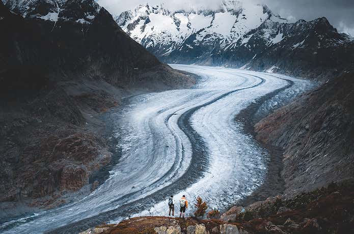 アルプス山脈の最大かつ最長で世界自然遺産にも登録されている氷河ですが、約 150 年前までは岩や氷を登ってアクセスできた山小屋に、今では 200mもの階段を使わなければ到達できなくなってしまいました。さらに温暖化の影響で、氷河の融解速度は年間1mに達し、今もなおペースは加速する深刻な状況に。