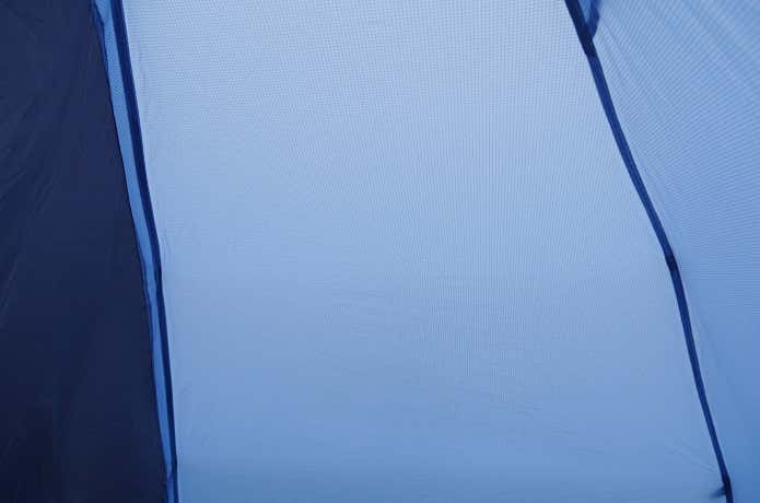 軽量化と強度を兼備するために採用された、ブルーの本体素材は20Dという薄手のナイロン。この薄さゆえに、テント場によってはフロアにグランドシートを敷く必要がありそうです。