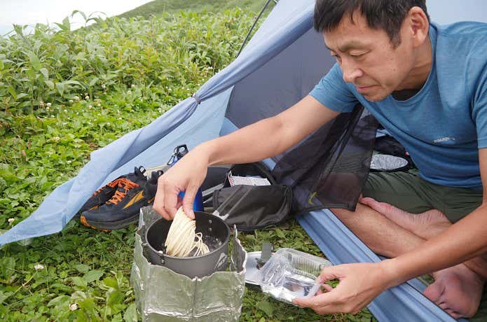 もし天気が悪ければ、お湯だけササっと沸かしてフリーズドライを食しますが、この日は前室のパネルを開け放った空間で、袋ラーメンをつくりました。