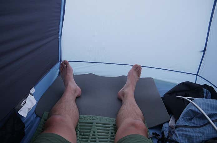 ですが今回は、気温が高くて寝袋には入らず、掛け布団のようにして使用したので気になりませんでした。が、しかし寝袋に入ったら、やはり壁に少し触れます。