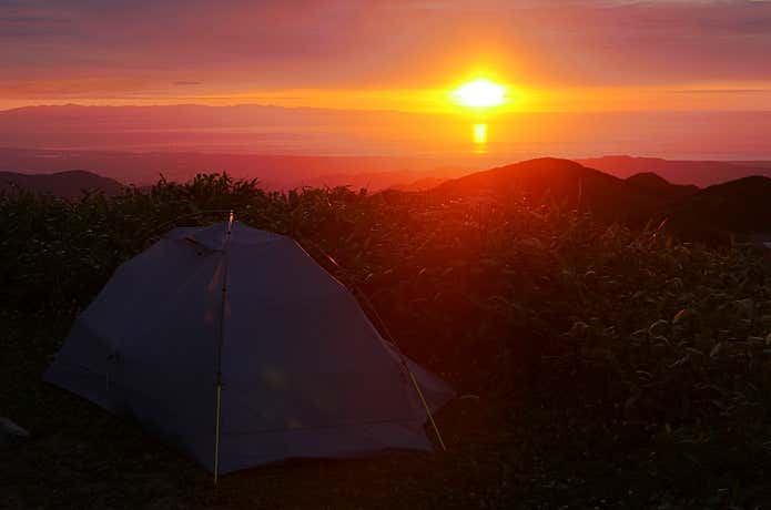 山の時間って、ノンビリと流れていくようで、空や山景色の移ろいを見ようと思うと、結構忙しかったりします。この日も低い雲が掛かっていて諦めていた日本海に沈む夕陽が、海のすぐ上でいきなり顔を出し、撮影タイム開始。