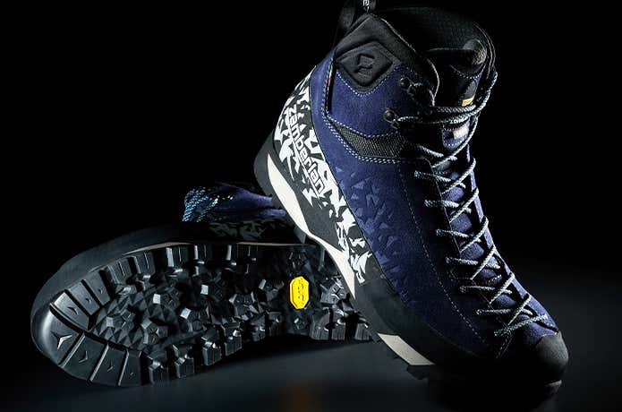 アウトソール(靴底)素材には、グリップ力の高いヴィブラムPepe(MEGAGRIP)を使用。つま先だけで狭い岩場に立ちこめるクライミングゾーンを配したパターンも採用しています。つま先まわりも岩などへ衝突や擦れから足を守るためランドラバーで補強されており、岩場でも安心して行動できるのです。