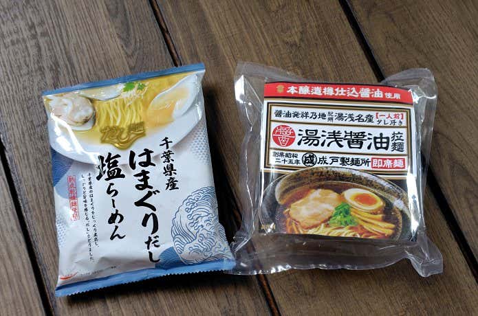 そして見つけたのが、『成戸製麺所/湯浅醤油拉麺(¥399)』と『tabeteだし麺/千葉県産はまぐりだし塩らーめん(¥232)』のふたつの袋ラーメンです。