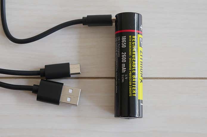 その専用電池は上画像の通り、USBタイプCの付属ケーブルで充電します。この付属ケーブルは、うれしいことに給電側にタイプAとCのコネクターが用意されているので、手持ちのモバイルバッテリーの接続がどちらであっても使用できます!