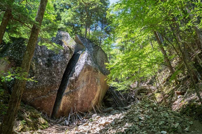 金峰山の見どころと言えば、なんといっても山頂で圧倒的な存在感を放つ五丈岩(ごじょういわ)。ヤマトタケルが東征の際に岩の下に社殿を立てたという伝説が伝わる由緒ある岩です。また、山頂からの360度ビューの絶景も魅力です。