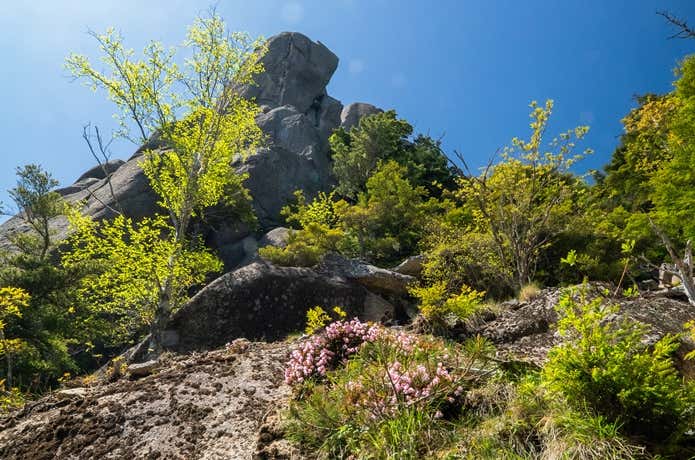 その見た目通り、登山コースには「桃太郎岩」や「大ヤスリ岩」 「弘法岩」 「十一面岩」などの奇岩が点在し飽きません。春はアズマシャクナゲ、秋は紅葉、山頂からは360度ビューの眺望で、一般登山者にも人気の山です。