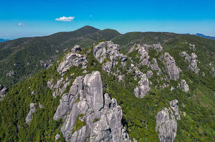 山梨県の「瑞牆山(みずがきやま:標高2230m)」は、全山が黒雲母の花崗岩で形成され、天に岩が付き立つ特異な姿が印象的な岩山です。ロッククライミングでも有名で、ボルダリングの聖地となっています。