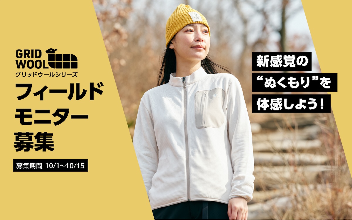 今回のモニターキャンペーンでは、グリッドウールを採用したミッドレイヤー3型からお好きなアイテムが提供されるので、様々なアクティビティでご活用のうえ、フィードバックをお送りください。いただいたフィードバックは、新素材の今後の展開にも活かされていきます。