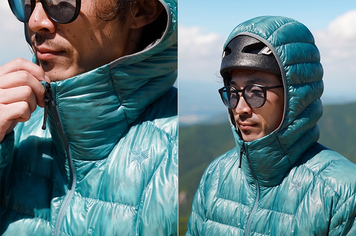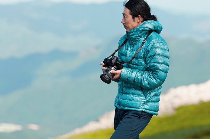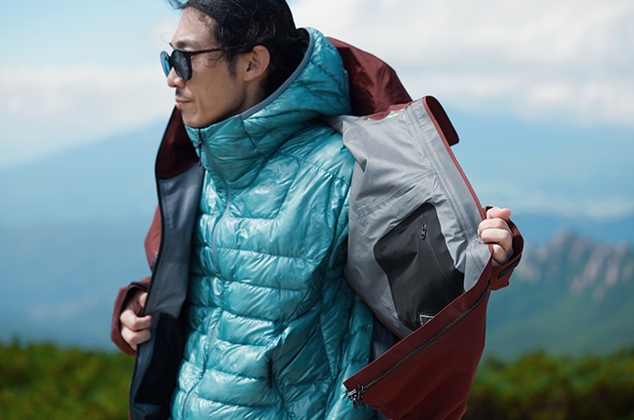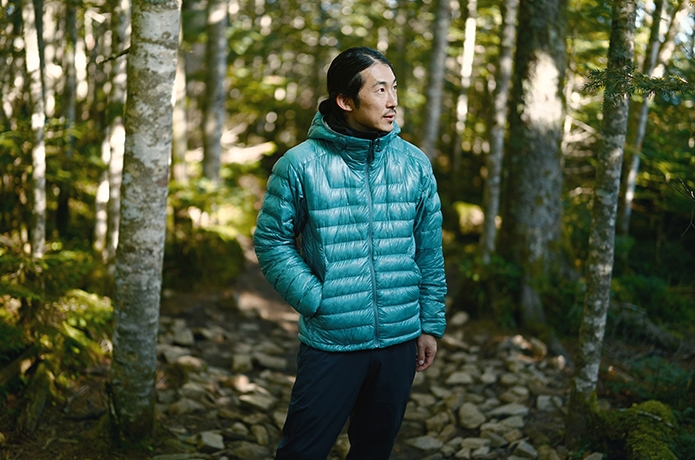 レイヤリングのしやすさも山で重宝するポイント。インナーダウンとしても動きを阻害しない美しいシルエットが、山の装いを引き立てます。
