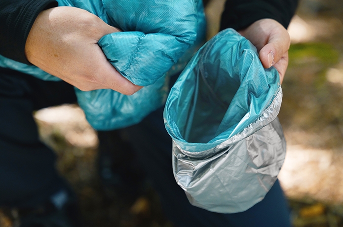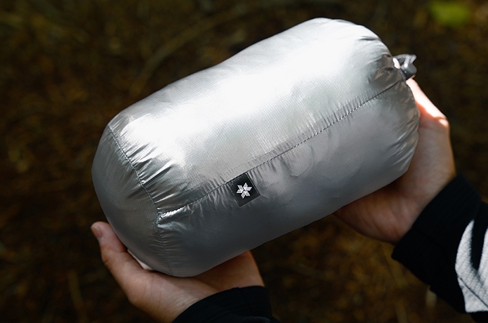 付属の収納袋にも注目です。表地にはチタンスパッタリング加工の生地を、裏地にはダウンのカラーに合わせた生地を採用し、見た目もおしゃれ。袋に収めればコンパクトになり、スマートに持ち運ぶことができます。