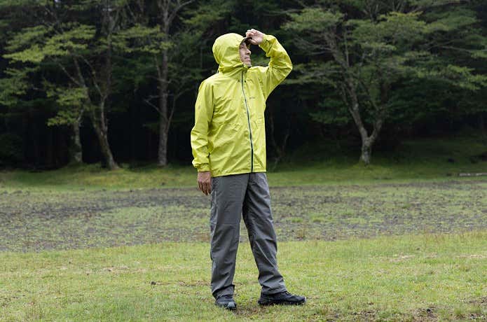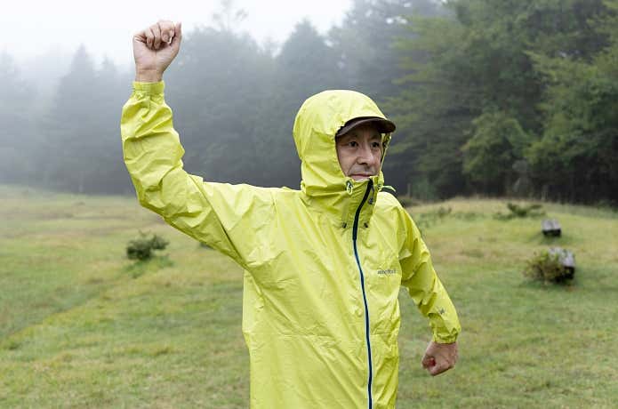 そしてモンベルのレインウエアはいずれも、肩まわりに縫い目がなく動きやすいカットパターン「K-Monoカット」」を採用しています。歩行だけでなく、岩場等で腕を大きく使う際に、ジャケットの裾が上がったり、背中が突っ張ったりもしません。ストレッチ生地でなくても、動きを考慮したパターンであれば、問題ないのです。素材の薄さも加わって、軽い着心地は運動性の高さを感じられました。