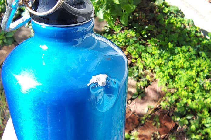 同じ重量ながら、落下させてしまった際には、樹脂製ボトルの場合、本体は問題ありませんでしたが、キャップが割れてしまいました。一方で、ラーケンのフツーラ1.0は、塗装が剥げ、凹みましたが(上画像)、割れはしませんでした。
