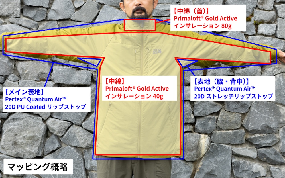 風を受けやすい前面や腕の中綿には「Primaloft® Gold Active」を封入してしっかり保温してくれます。特に保温したい首元には80gと多めに配分。