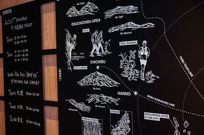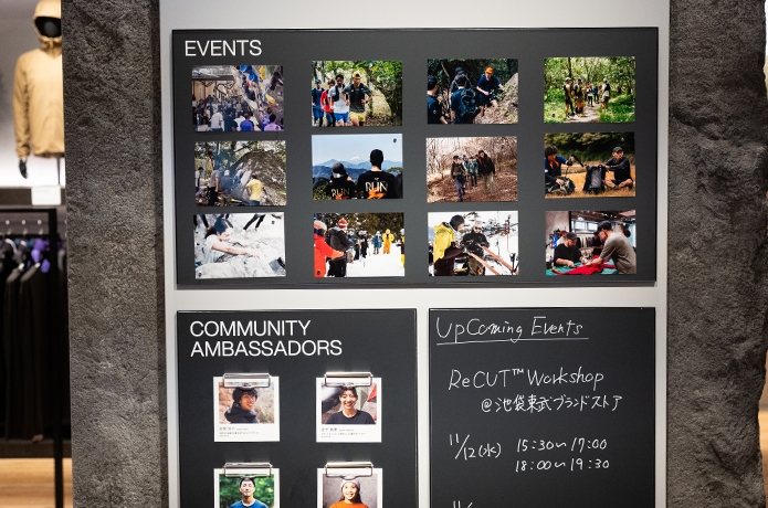 店内奥には、アウトドア好き同士が気軽に集えるコミュニティスペースを常設。アンバサダーやスタッフの紹介、ReBIRD™が持つ“長く使い続ける”という哲学、イベント情報などがまとめられたコミュニティボードから、ブランドの「ヒト・モノ・コト」を発信しています。