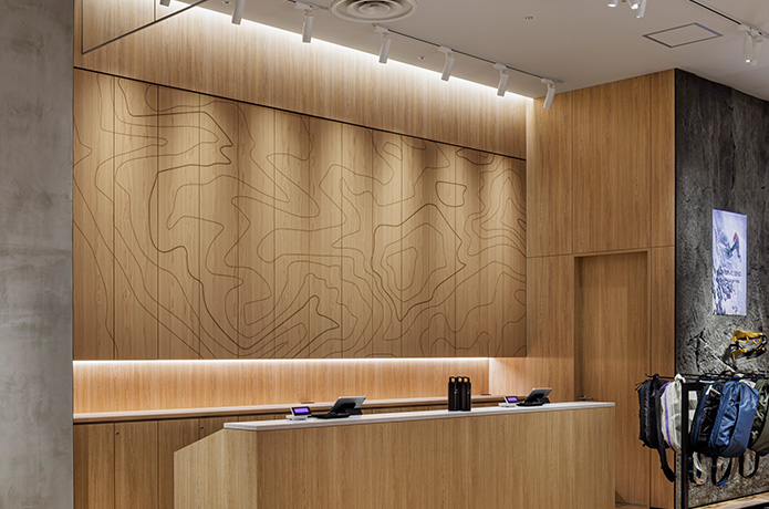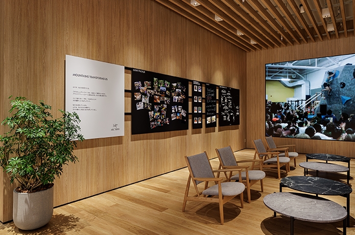 柱や壁はまるでスコーミッシュの岩肌を感じれるよう演出され、アークテリクスの原点であるアルパイン・クライミングの世界観を空間に落とし込んでいます。