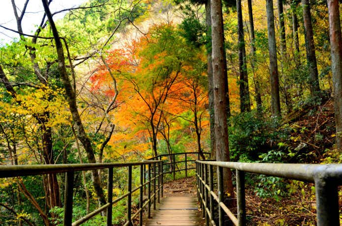 その先に現れる鳩ノ巣小橋は、このコース屈指の絶景ポイント。新緑の季節はみずみずしい緑が、紅葉の季節は渓谷全体が赤や黄色に染まり、まるで絵画のような風景が広がります。