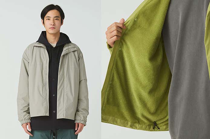 表地には、裏面に防風性を付与する加工を施した、軽量で引き裂き強度の高いリサイクルポリエステルの20デニールダブルリップストップ素材を使用。裏地には、軽量性、吸水速乾性が特徴の帝人フロンティアの「Octa」が採用されています。