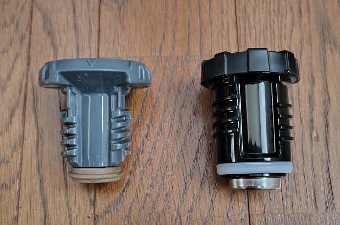 上画像左はサーモスの中栓です。中栓の湯が通る溝はやや細め、栓の上部の湯が出る傘のような部分が大きく、広くなっています。この形状は、湯を太く、多く注ぐのに適していますが、細く注ごうとすると左右にヨレてしまいます。画像はありあませんが、モンベルもこのサーモスと似た形状のため、湯がヨレます。