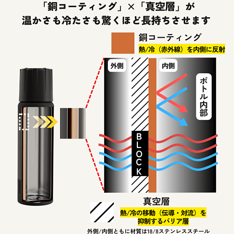 ボトル本体の内部構造に、アルパインスター、ジェムストーンの違いはないようです。ともに、上イラストのようなステンレス真空二重構造を採用。内側のステンレス壁には銅コーティングが施され、赤外線を反射。湯または水の温度を保つ仕様になっています。