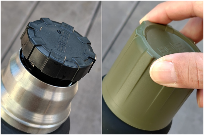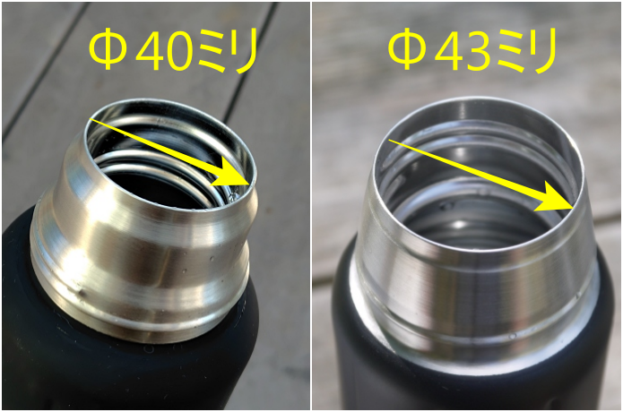 上画像右はジェムストーンで口径は43ミリ、左アルパインスターは40ミリです。ボトルに湯を入れた際に熱が逃げるのはこの口部から。それが3ミリ細く絞られているので、わずかな差ですが、熱が逃げにくくなったことが考えられます。