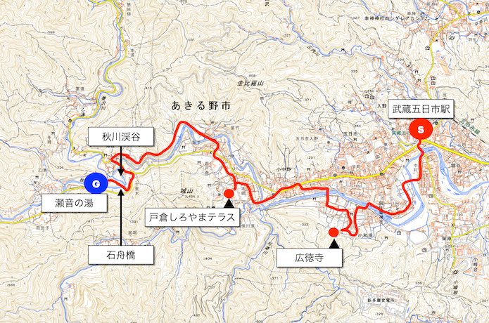 紅葉ハイキングにおすすめなルートは、武蔵五日市駅からスタート。イチョウの大木が見事な広徳寺に立ち寄った後、何度か橋を渡りながら秋川沿いの紅葉を楽しみます。