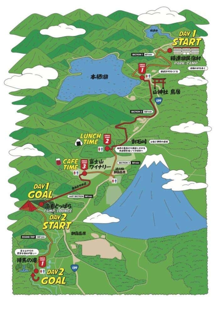 1日目は、山梨県にある精進湖民宿村をスタートし、3つのチェックポイントを通過してふもとっぱらへ。道中は、本栖湖や割石峠、富士山ワイナリーなどの見どころ満載でした。