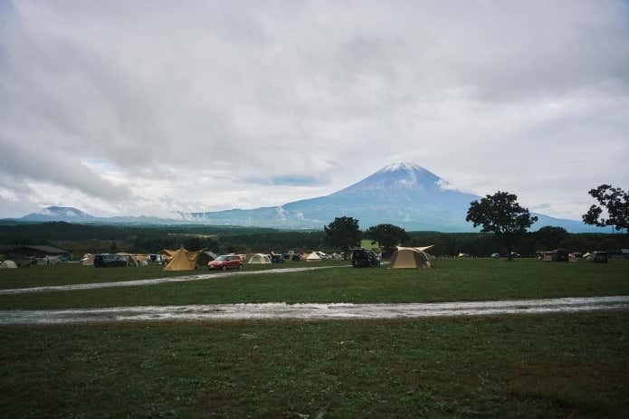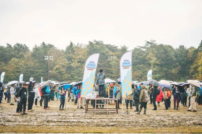 1日目のハイキング後は、ふもとっぱらでウェルカムイベントが開催。当日はあいにくの雨模様でしたが、協賛企業のブースでショッピングやワークショップを楽しんでいる人もいました。