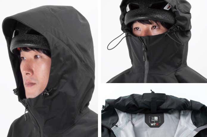 ヘルメット対応フードはロールアップですっきり収納可能。鼻まで上げられるファスナーで風や雪を防げます。