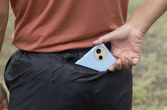 腰部にも、スマホ収納にちょうどいいポケットを装備。座った時にスマホが地面や座面に当たらない深さになっています。ポケッタブル機能は、このポケットを裏返して、本体を収納します。