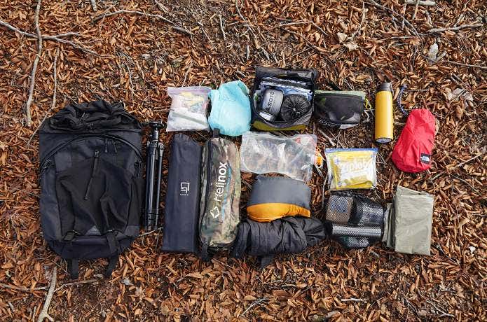 重量はテント想定のチェア、寝袋&マット想定のテーブルともに0.9kg。カメラと三脚は1.8kg、山コーヒードリップセット0.8kg。それらで食料と着替え分として、防寒着上下、ストーブ&クッカー、エマージェンシーアイテム&ファーストエイドキット、水2リットル、サーモボトルにお湯0.5リットル、ミニテーブル、レトルトカレー&フリーズドライごはん、エマージェンシーシート、貴重品を装備しました。