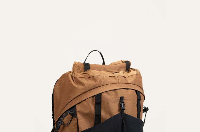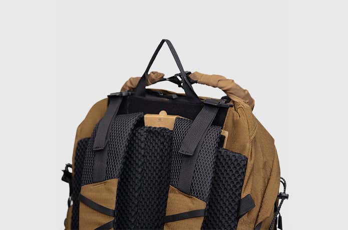 というのも、モマドを空荷で上部から押すと柔らかいのですが、荷物を入れて押すとバネのような弾力が出てきます。背面パネルフレームが、パックと背中にチュラルな一体感を生んでくれるんです。