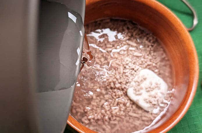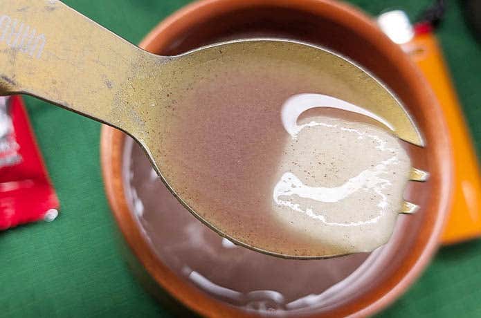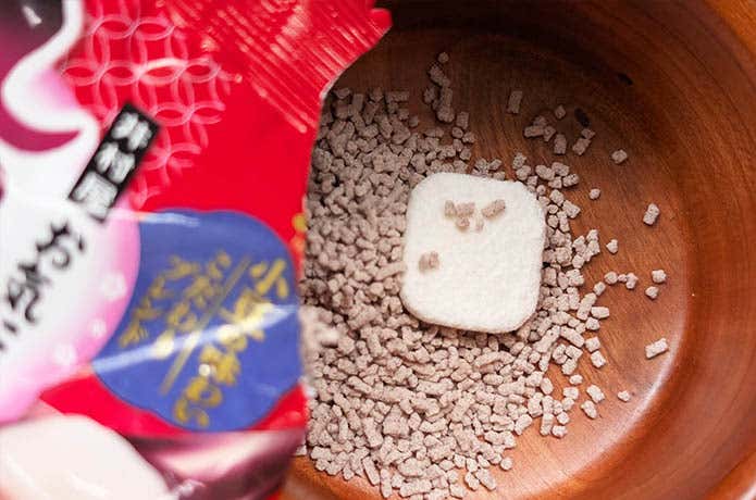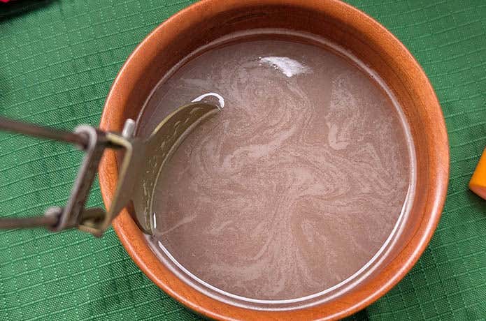 中にはフリーズドライの小豆ブロックと真っ白な乾燥餅が。 ここにお湯を注いで、ぐるぐるかき混ぜること1分。