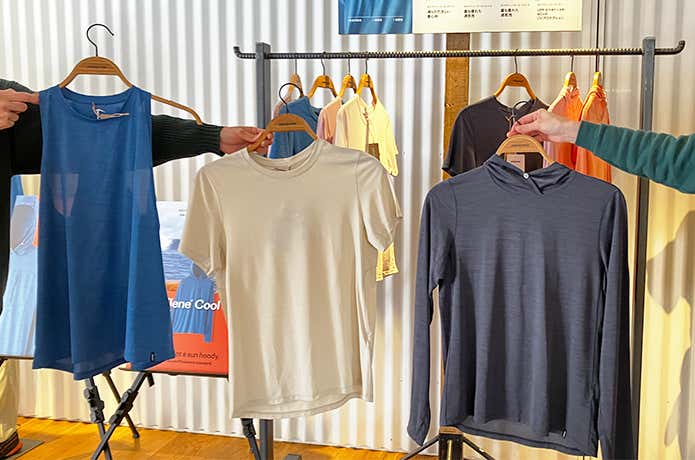 ウェアだけでなく、キャップやハットもカラフル。シンプルなTシャツに合わせるだけで、ぐっと夏らしいスタイルに仕上がります。山行はもちろん、フェスや旅行、街歩きでも活躍しそうなカラー展開。「今日は何色にする?」と選ぶ時間も楽しくなるラインナップでした。