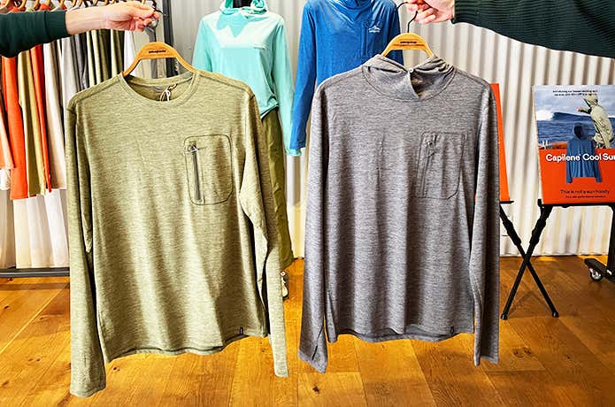 もうひとつの注目が、UV対策を強化した『キャプリーン・クール・サン』。UPF 40+のカバー力を備えながら、吸湿速乾性も両立。サーフィンやフライフィッシングはもちろん、山やキャンプまでシームレスに対応します。