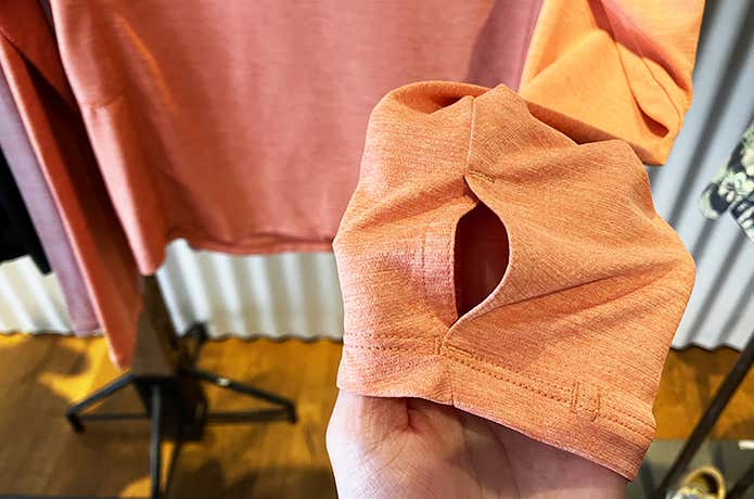 生地自体に酸化チタンを練りこんでいるため、洗濯を繰り返してもUV機能が持続。化学処理に頼らない設計もポイントです。袖口のサムホールにより手の甲までカバー可能。