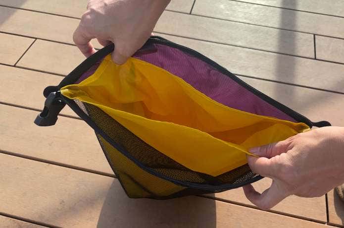 このように、タオル、着替えや汚れ物、アメニティを分けて入れておくことができます。ポーチと同じように裏側はメッシュ素材なので、忘れやすいものはこちら側に入れておくのもおすすめ。