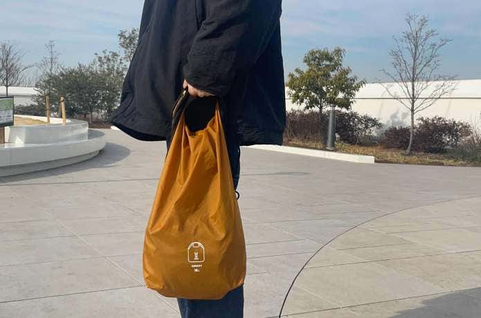 「ミッツ・ワケブクーロ」は16リットルサイズで、中身の量に合わせて大きさを調整することが可能。荷物を入れて開閉部をくるくる巻いていくと……