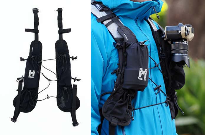 本製品の最大の特徴は、バックパックのショルダーハーネスに直接装着できる点です。