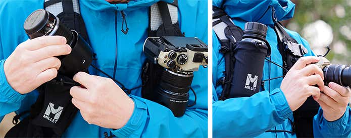 交換レンズや予備バッテリーなどの機材を身体の前面に保持できるため、岩場や足場の悪い場所でも、ザックを下ろす手間なくスムーズに機材を取り出せます。