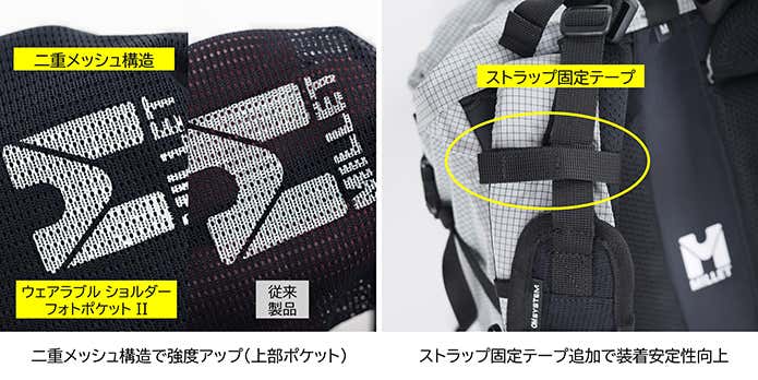 - 耐久性の強化 使用頻度の高い上部ポケットには「二重メッシュ構造」を採用。過酷なアウトドア環境での繰り返し使用に耐える強度を確保しています。