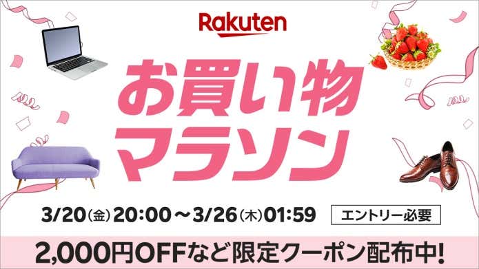3月20日(金)20:00〜26日(木)1:59までの期間中は、楽天お買い物マラソンも開催!エントリーして複数ショップでお買い物をすると、ポイント還元率が最大11倍にアップ。さらにお得な限定クーポンもあるので、上手に活用して賢くお買い物しましょう。
