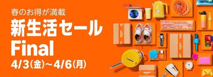 Amazon新生活セールFinalの本番は、2026年4月3日(金)0:00〜4月6日(月)23:59まで。先行セール期間を含め、3月31日(火)0:00〜4月6日(月)23:59の間に10,000円以上のお買い物をすると対象項目がポイントアップするお得なキャンペーンも実施中です。