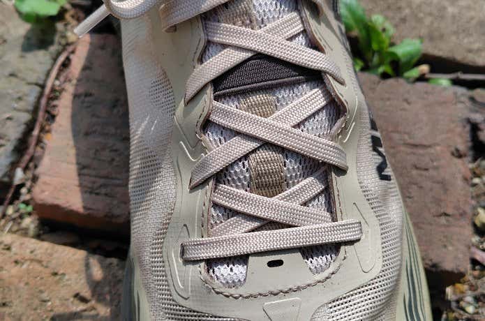 この薄いタンは、最近のトレイルランニングシューズの流行りでもあります。それに合わせて採用されているのが、平紐タイプのシューレース。圧力が分散されることで、締めた際に甲へ食い込みにくいのが特徴です。