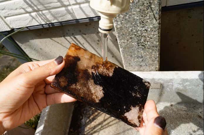 お手入れ方法は”お湯で流すだけ”と、とっても簡単!焦げが酷いところはナイフの刃じゃない裏側で軽くこすると、すぐに落ちますよ。