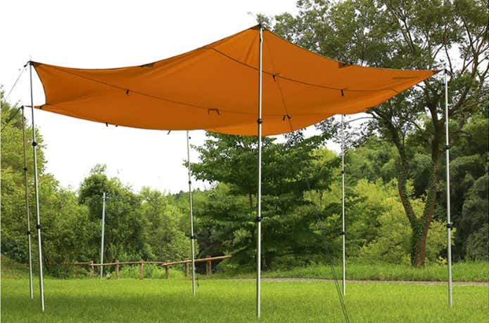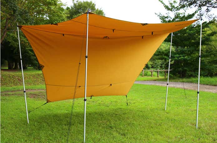 タープがひし形で2本のポールで立てる小型タープ。一人でも設営がしやすく他のに比べてコンパクトなので、ソロやツーリングキャンプなどにも適しています。こちらもロープの張り方などでアレンジが可能です。